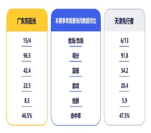 篮板方面,天津队的最大威胁来自詹姆斯,其以场均10.2篮板排在联盟第一。首回合比赛,广东队依靠全队之力抢下48个篮板,领先对手10个,是取胜的另一主因。此役,广东队需进一步强化既有优势,做好协作与执行,合力保护篮板生命线。