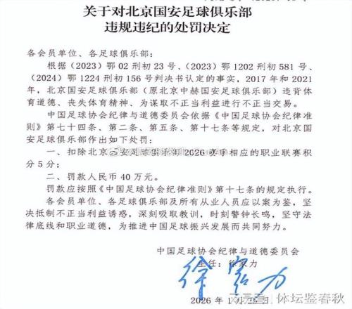 当时,俱乐部在个别事项上存在明显偏离职业足球基本准则的行为,在竞技层面之外,试图通过不正当方式获取额外利益,这种操作既违背了体育道德,也触碰了行业底线。基于这些问题,中国足协对北京国安作出了明确的处罚决定,新赛季相应职业联赛积分被扣除5分,同时处以40万元的罚款。