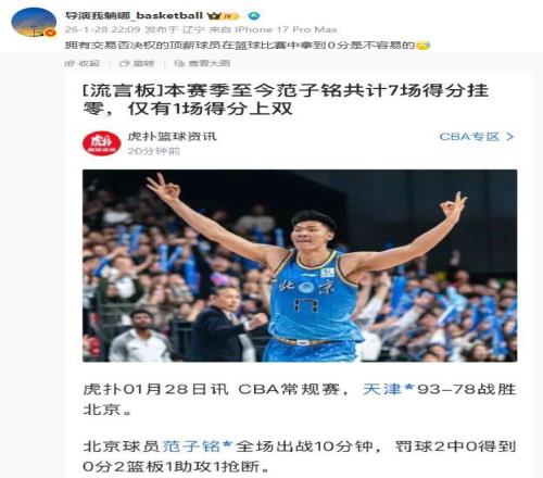 1月28日晚,北京男篮客场爆冷,输给了鱼腩球队天津队。比输球更叫人无语的是,球队内线顶薪球员范子铭的发挥,堪称史诗级灾难!如此顶薪,真的是愧对许利民信任。
