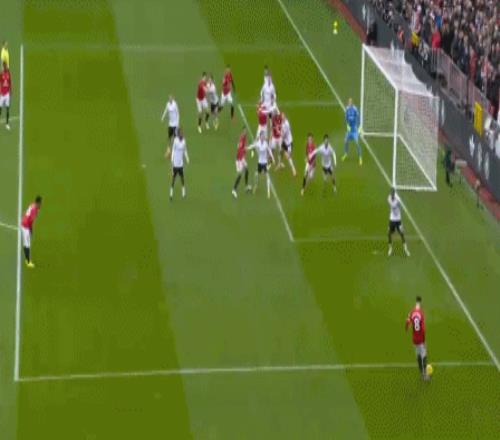 第18分钟,曼联右路禁区线定位球机会,B费开到禁区后点卡塞米罗头球破门,曼联1-0富勒姆。